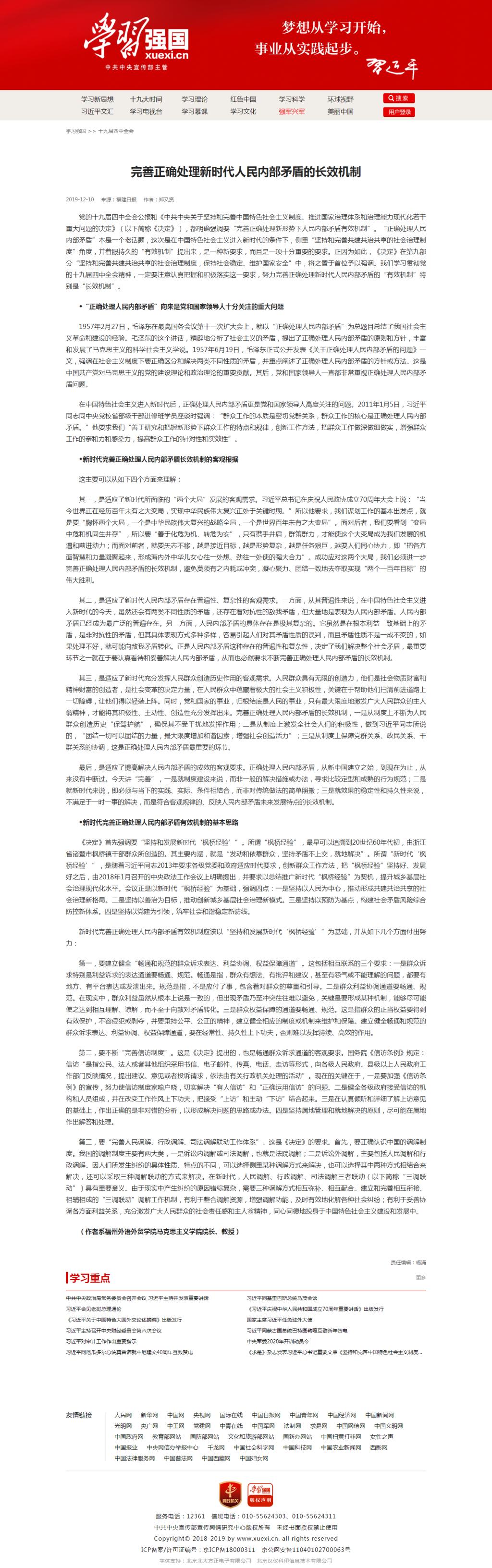 学习强国转载:完善正确处理新时代人民内部矛盾的长效机制