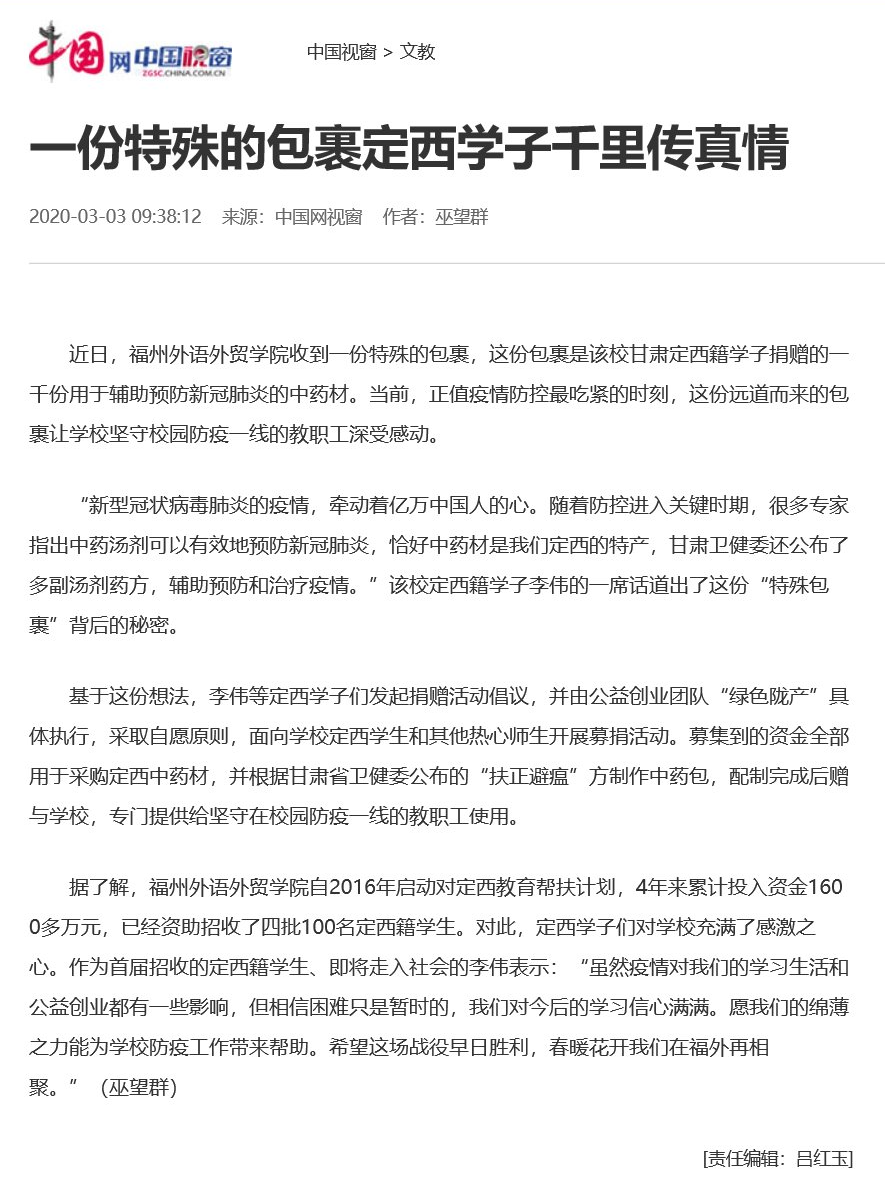 中国网中国视窗报道:一份特殊的包裹定西学子千里传真情