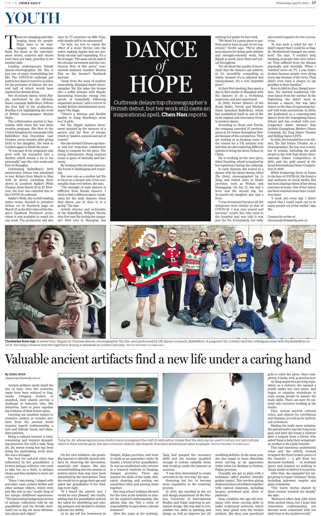4月8日,《中国日报》以《Valuable ancient artifacts find a new life under a caring hand》为题报道我校优秀校友瞿汕(艺名:唐潔)在传承和发扬古文物修复技艺方面的事迹。报道以采访及插叙的方式将唐潔自幼与古文物结缘、不断精进多样技艺、成长为古文物修复师再到积极传播传统文化的经历娓娓道来,为读者们呈现了一名别样的“90后”女孩的故事。