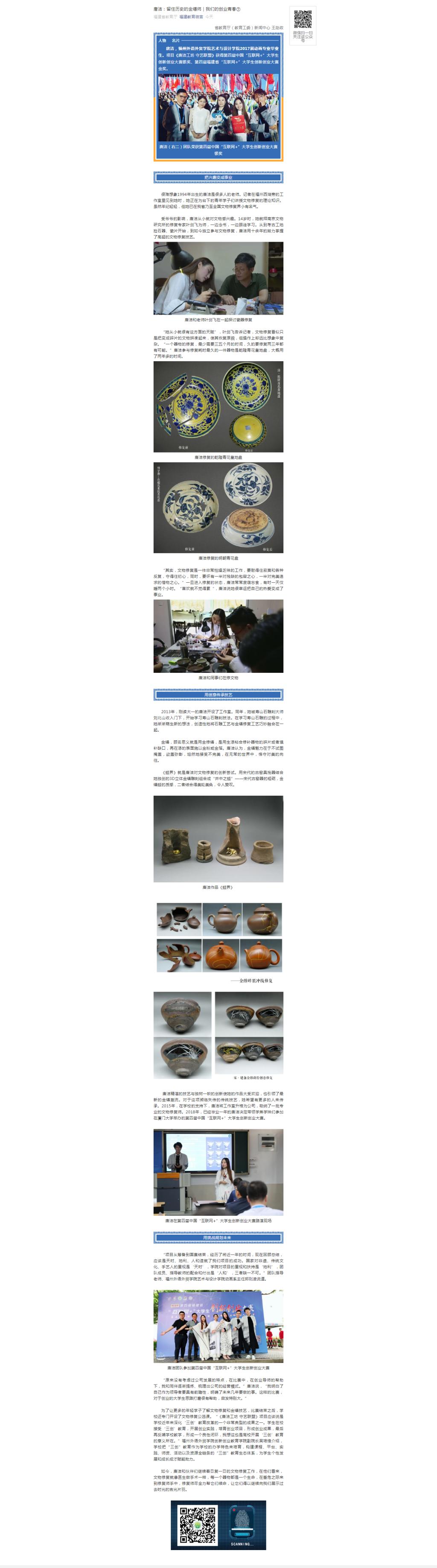 福建教育微言公众号报道:唐洁:留住历史的金缮师|我们的创业青春⑦
