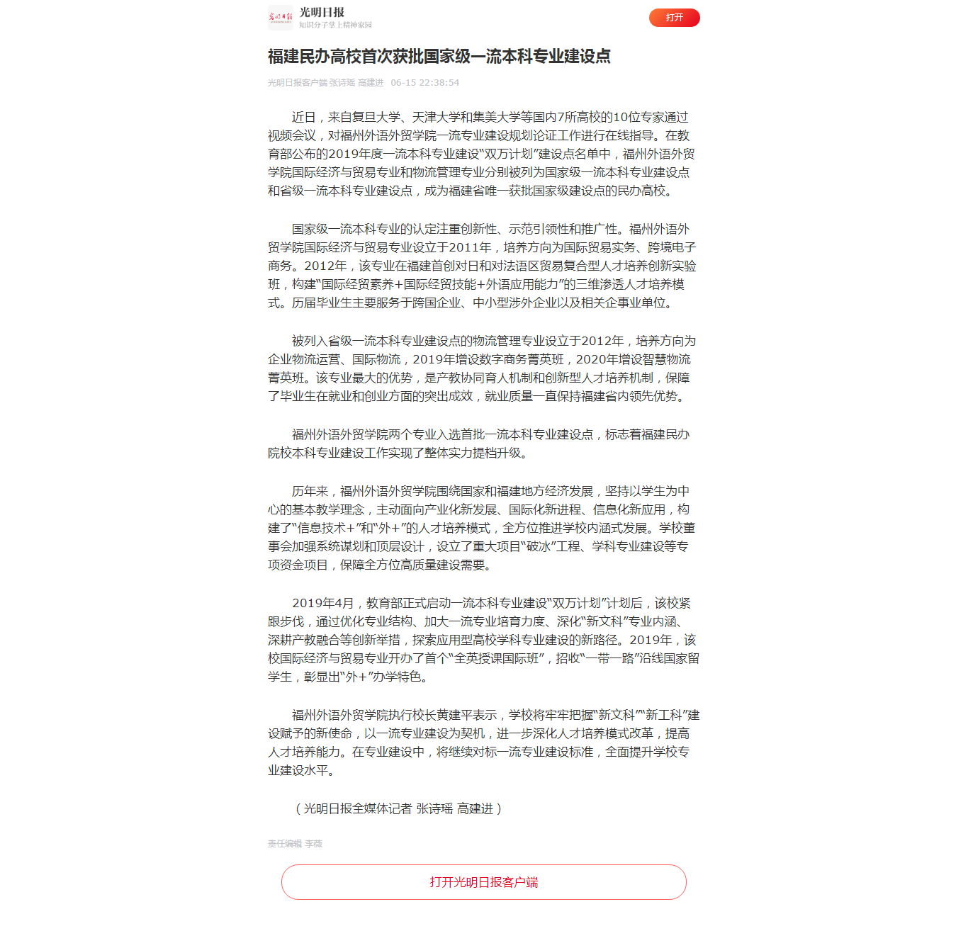光明日报报道:福建民办高校首次获批国家级一流本科专业建设点