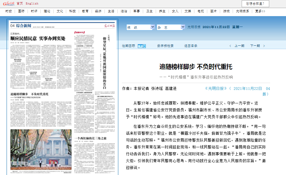 光明日报报道:追随榜样脚步 不负时代重托——“时代楷模”潘东升事迹引起热烈反响