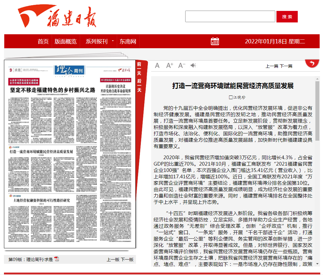 福建日报刊发我校教师文章:打造一流营商环境赋能民营经济高质量发展