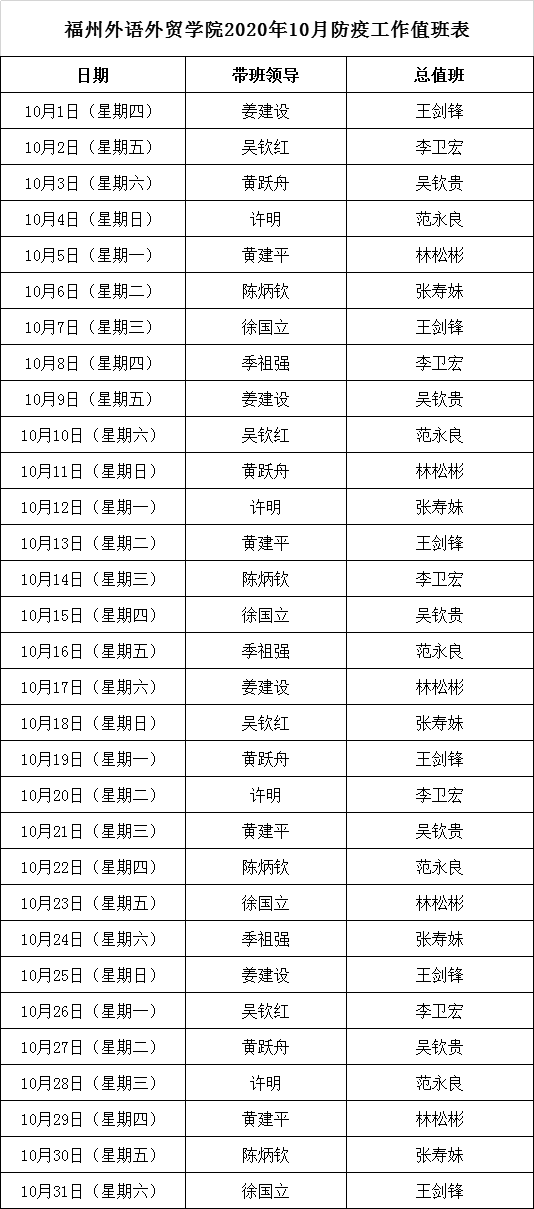 pg娱乐电子游戏2020年10月防疫工作值班表