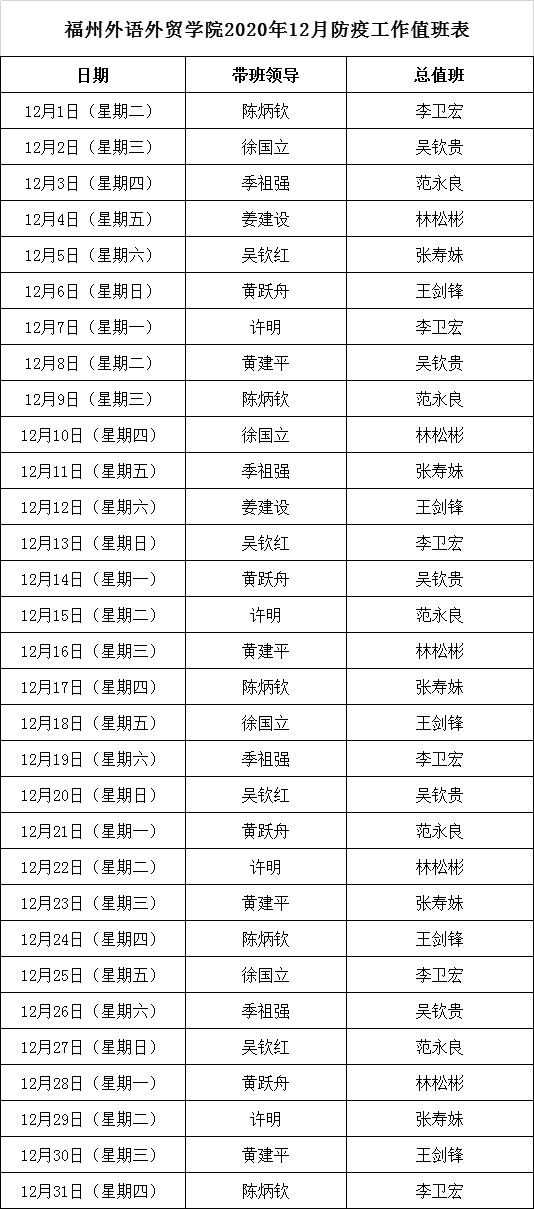 pg娱乐电子游戏2020年12月防疫工作值班表