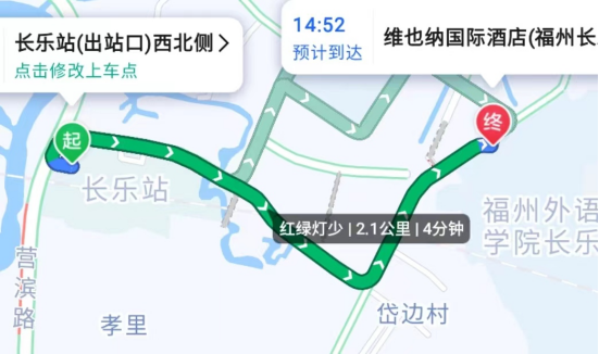 3、“长乐站”:从“长乐站”到“维也纳国际酒店(福州长乐动车站外语外贸店)”约4分钟,打车约:9-12元。