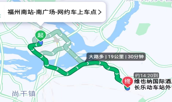 或从“福州南站南广场”到“维也纳国际酒店(福州长乐动车站外语外贸店)”约30分钟,打车约:37-41元。