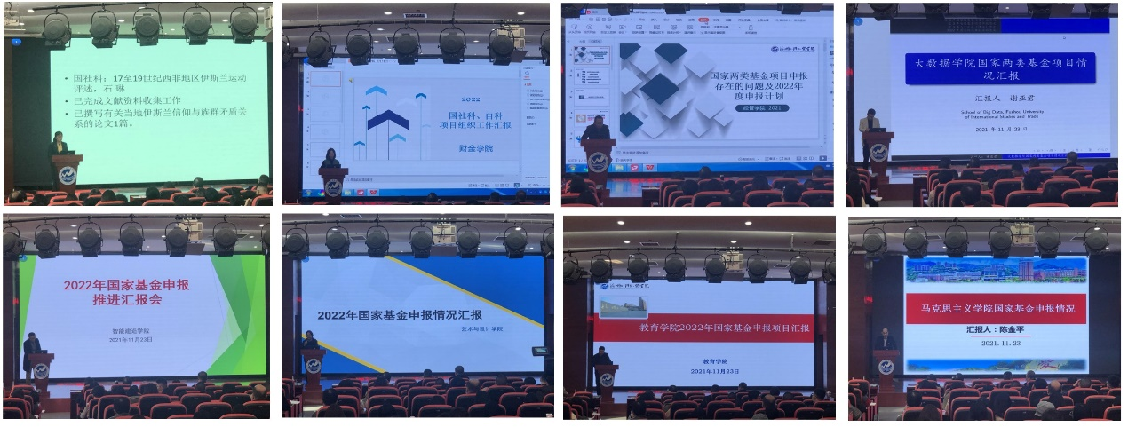 会上,研究与发展中心对国家两类科学基金作了相关介绍,对2021年国家科学基金资助概况进行汇报,分析了2021年我校两类科学基金申请情况,同时部署2022年申报目标以及下一阶段工作任务与进度安排。外国语学院、财金学院、经管学院、大数据学院、智能建造学院、艺术与设计学院、教育学院、马克思主义学院院长交流了2021年申报工作经验与不足,汇报了2022年申报组织工作重点及亮点。