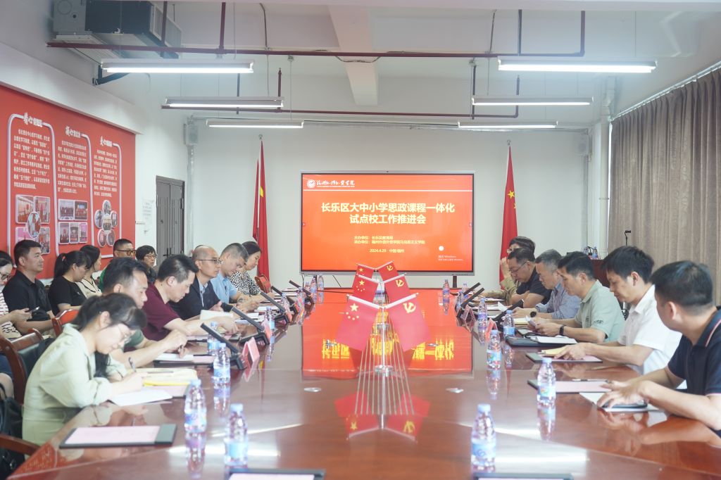 4月29日,长乐区大中小学思政课程一体化试点校工作推进会在我校召开。长乐区教育局教育督导室主任、区委教育工委委员吴忍心,五所试点校负责同志以及相关教师代表出席会议。会议由区教育局思政体艺科科长陈治顺主持。