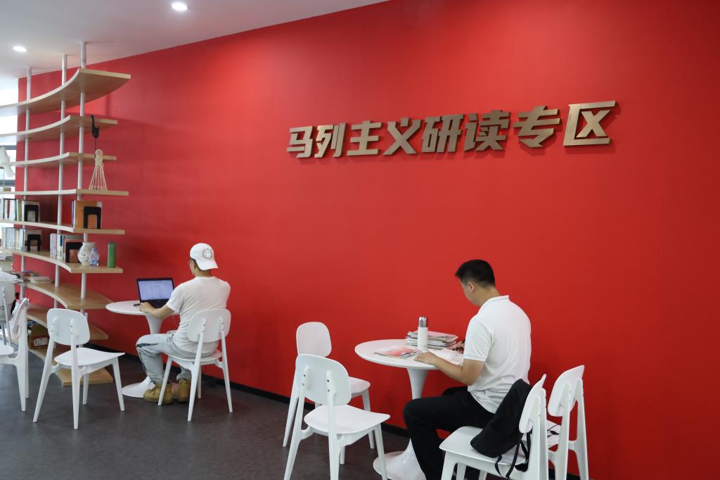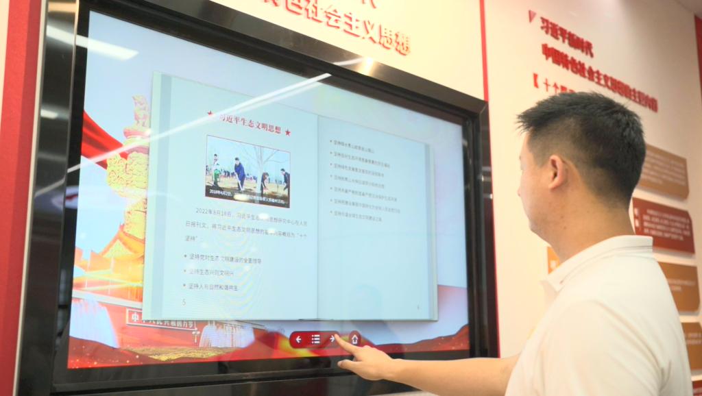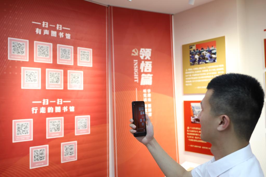 活动中,大家依次参观了馆内领航篇、领悟篇、百年辉煌、践行篇等内容版块。在馆内领航篇版块,大家通过诵读“十个明确”“十四个坚持”“十三个方面成就”等对习近平新时代中国特色社会主义思想进行了深入学习,并通过互动触摸屏查看习近平新时代中国特色社会主义思想的内容,进一步强化理论学习。在领悟篇版块,大家通过手机扫“有声图书馆”和“行走的图书馆”二维码,学习体验《党的二十大报告学辅导百问》和《习近平新时代中国特色社会主义思想三十讲》等电子书籍。