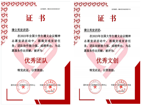 2024年6月,团中央青年志愿者行动指导中心、中国青年志愿者协会公布了“2023年全国大学生遵义会议精神100支优秀宣讲团队名单”,蒲公英宣讲团从全国540所高校的1000支宣讲团队中脱颖而出,荣获全国“优秀团队”称号和“优秀文创”荣誉。